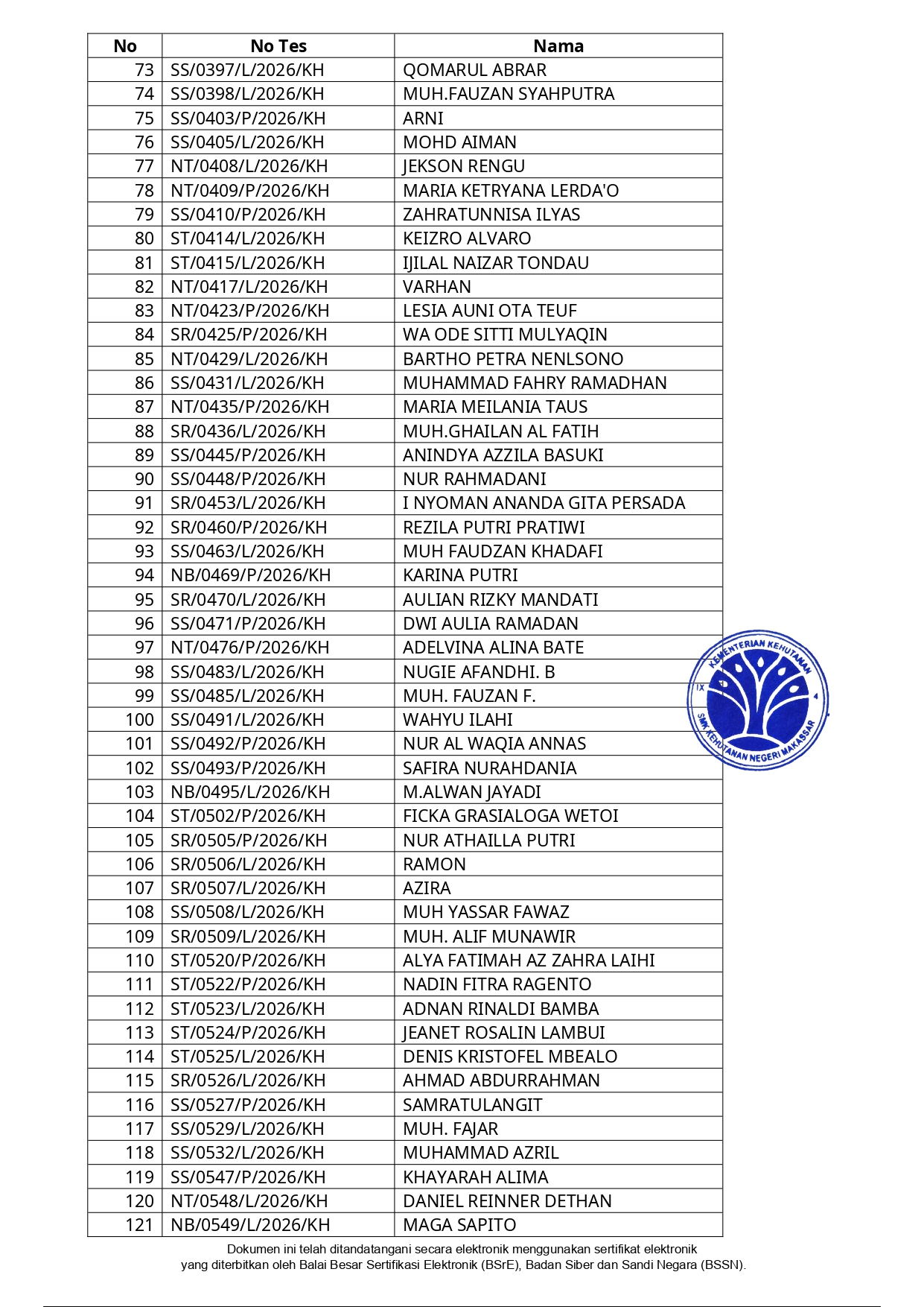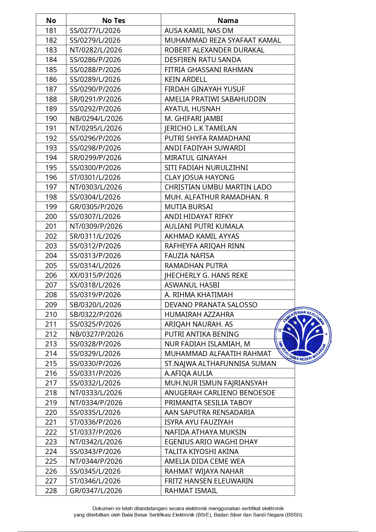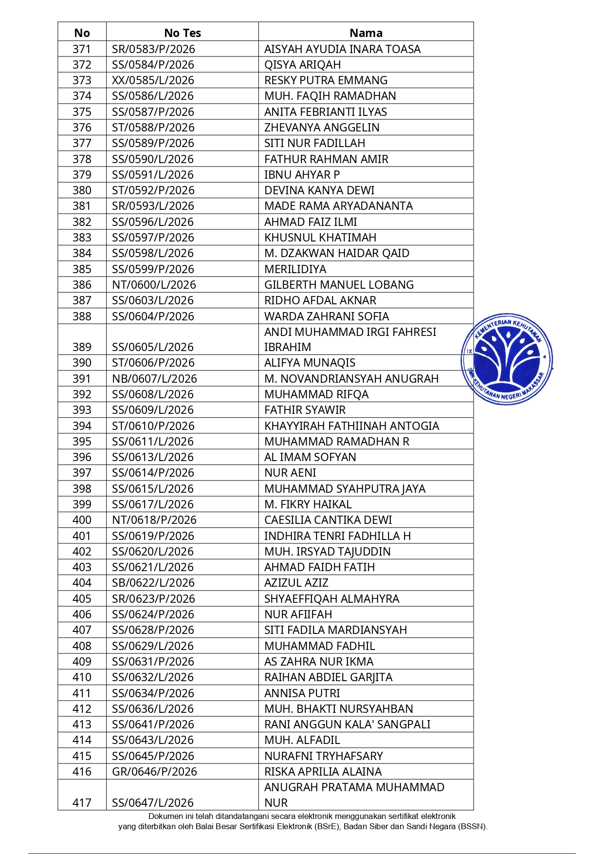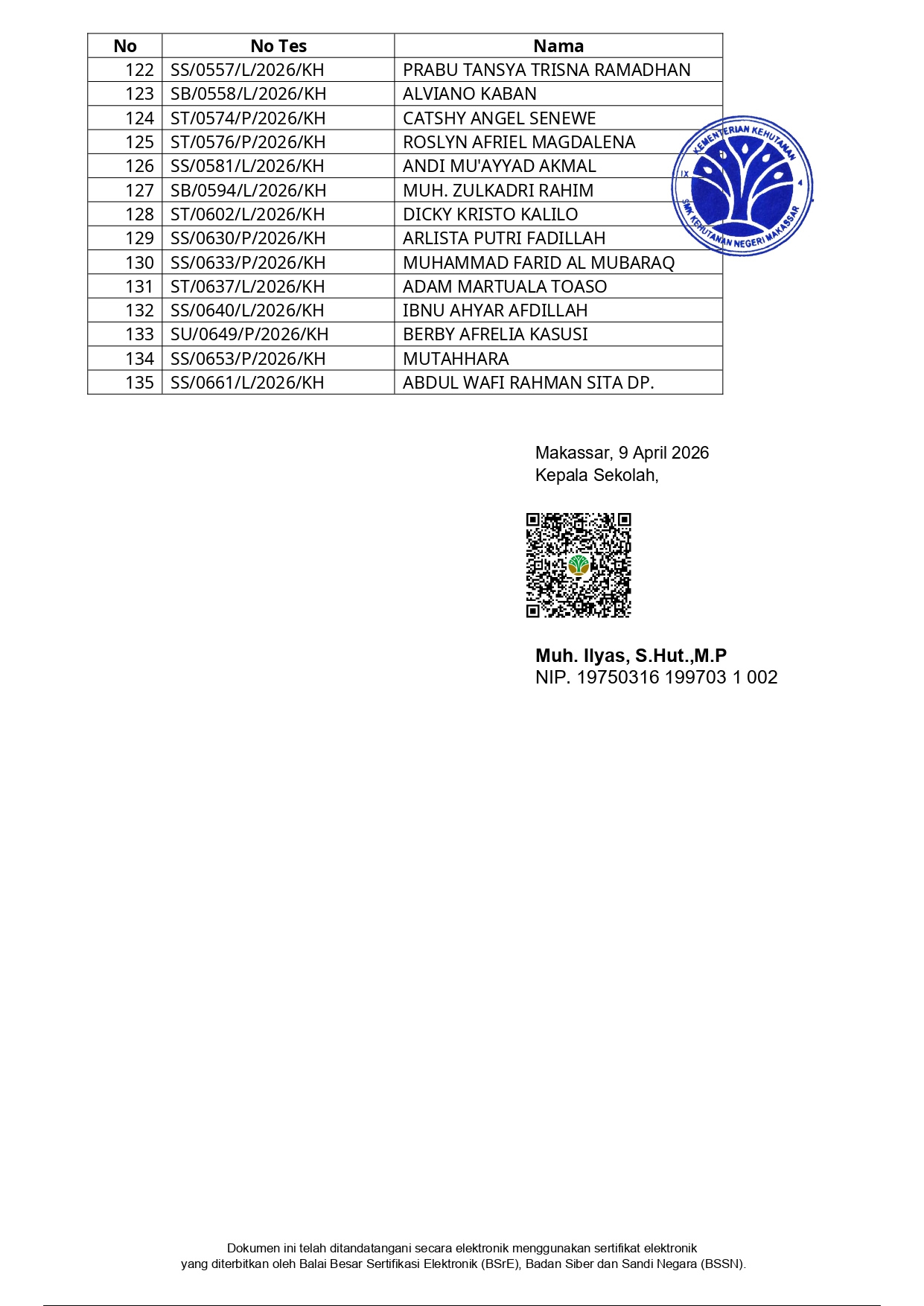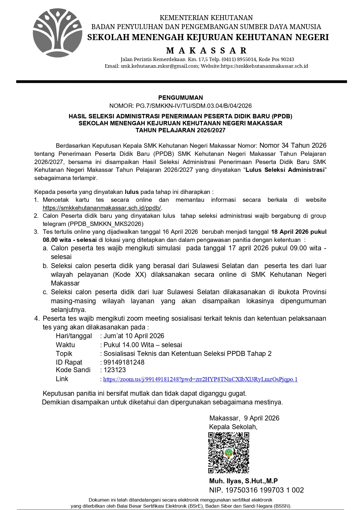 Hasil Seleksi Administrasi Penerimaan Peserta Didik Baru (PPDB) SMK Kehutanan Negeri Makassar Tahun Pelajaran 2026/2027