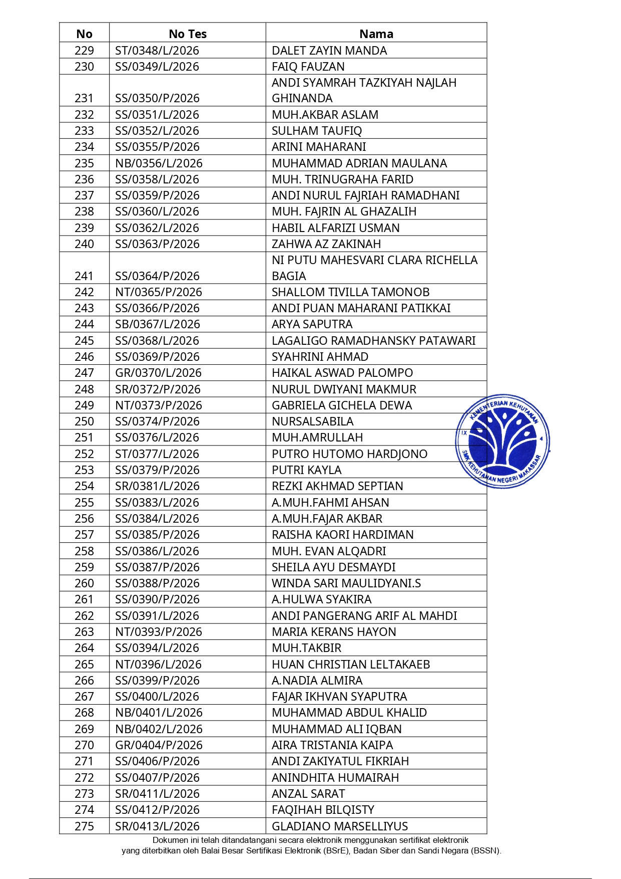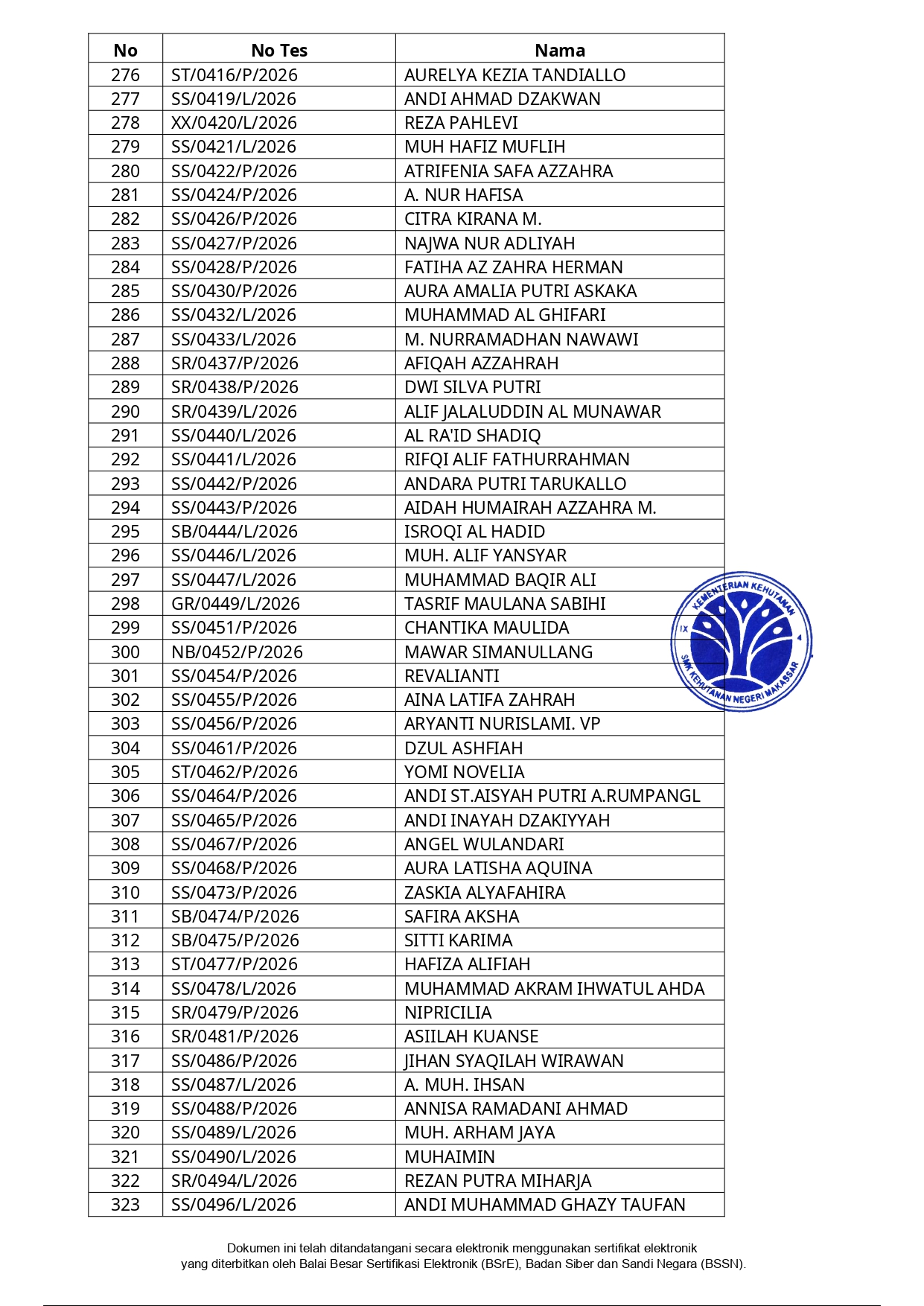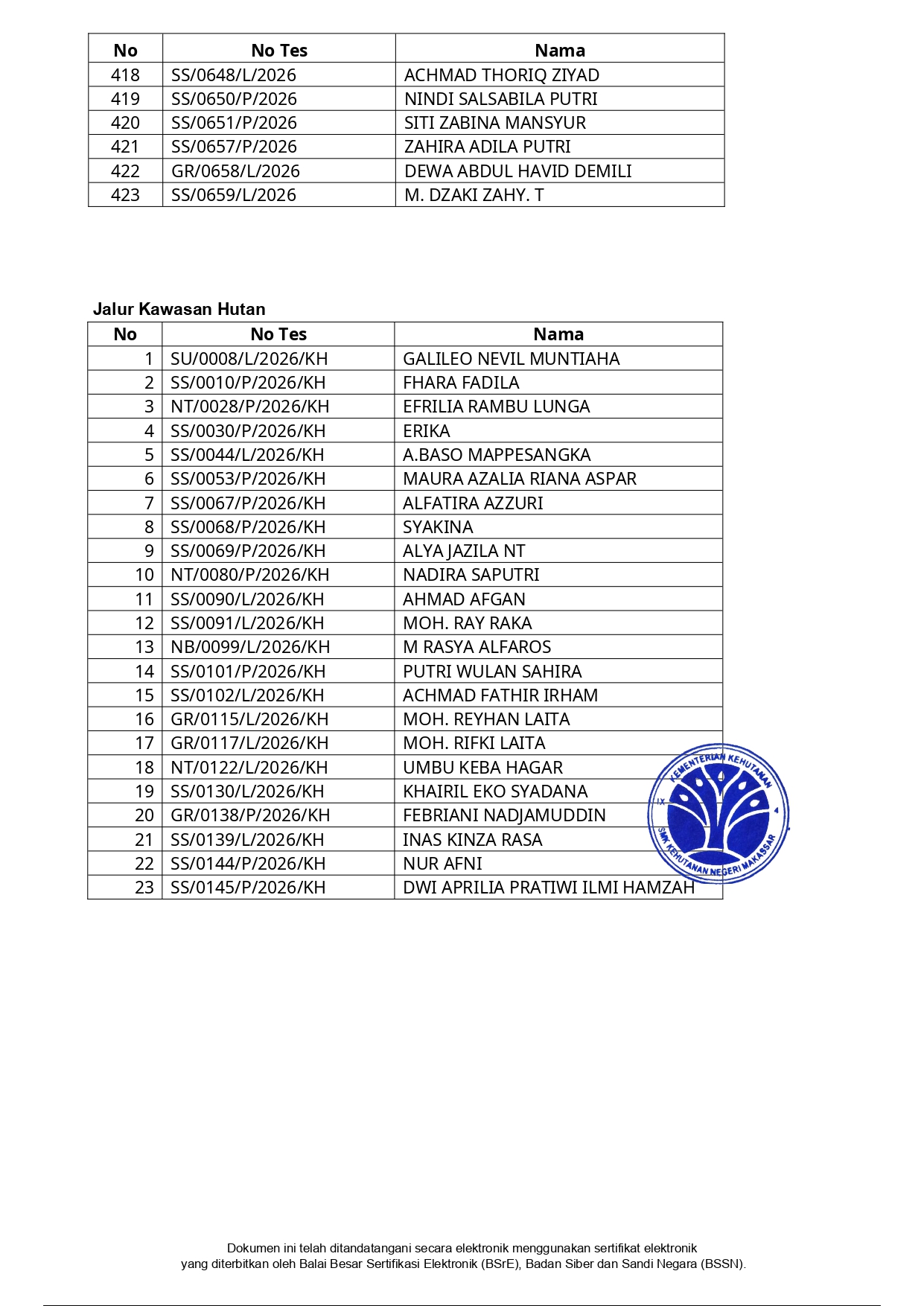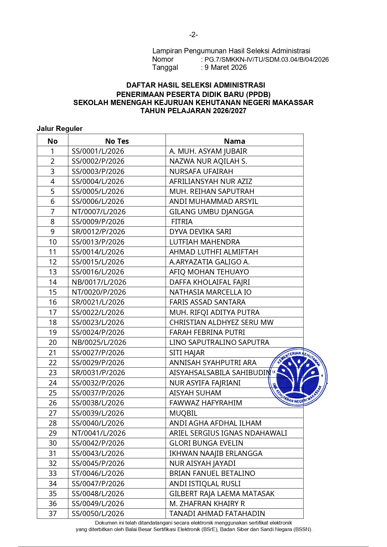 Hasil Seleksi Administrasi Penerimaan Peserta Didik Baru (PPDB) SMK Kehutanan Negeri Makassar Tahun Pelajaran 2026/2027