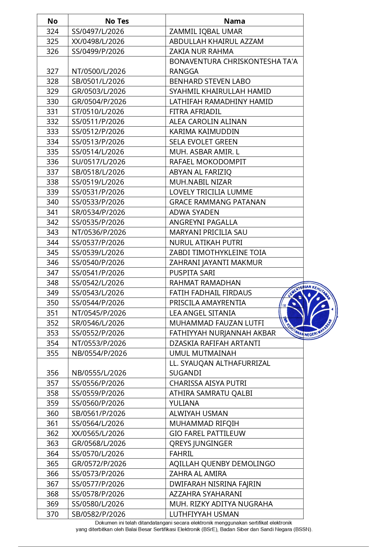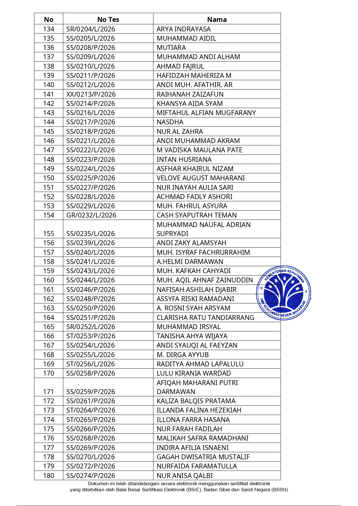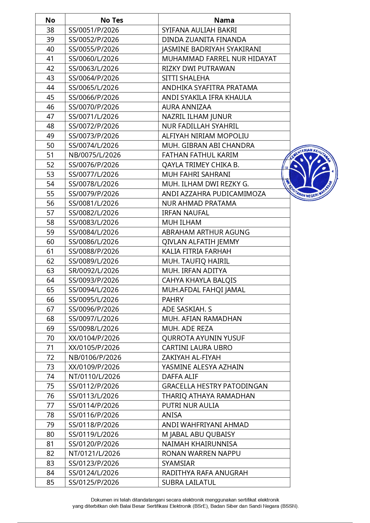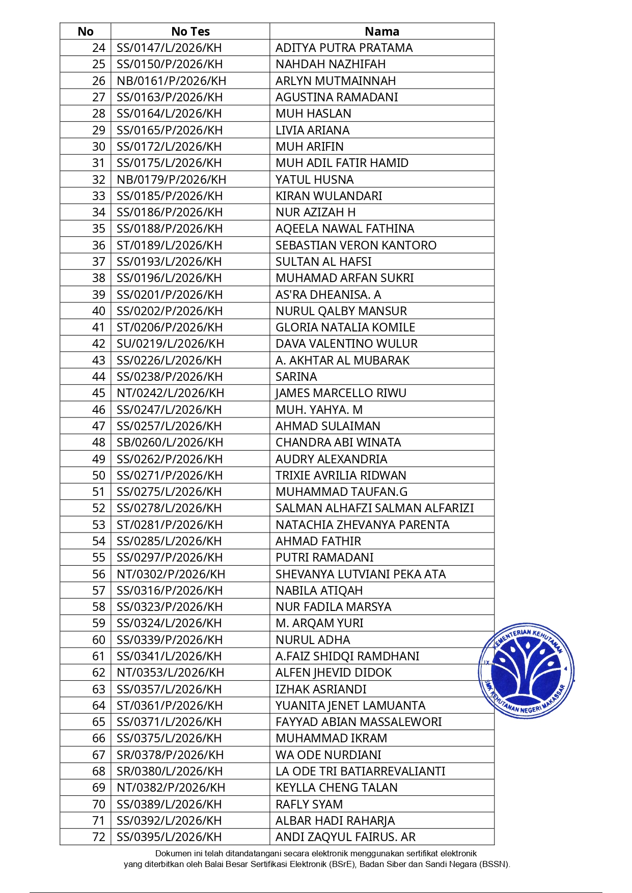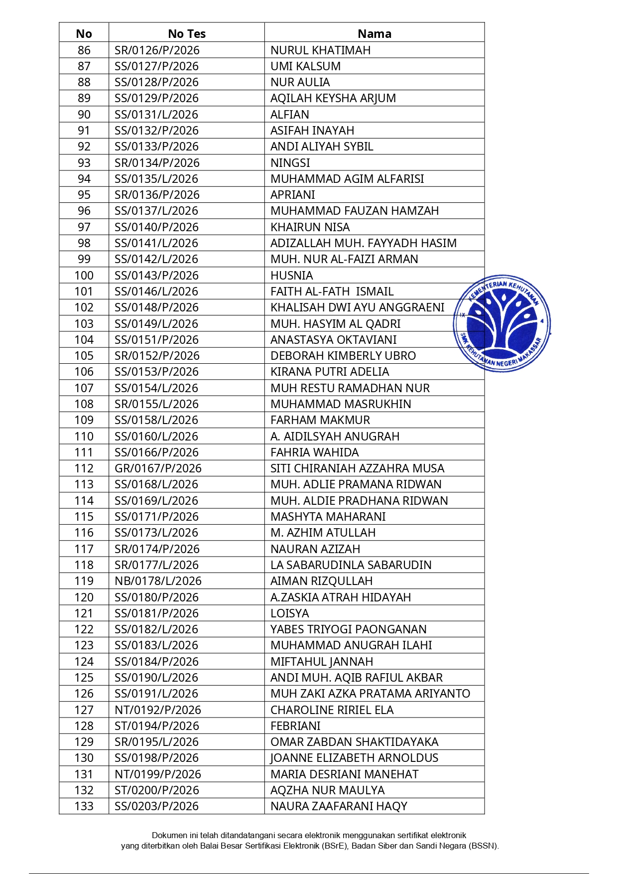Hasil Seleksi Administrasi Penerimaan Peserta Didik Baru (PPDB) SMK Kehutanan Negeri Makassar Tahun Pelajaran 2026/2027