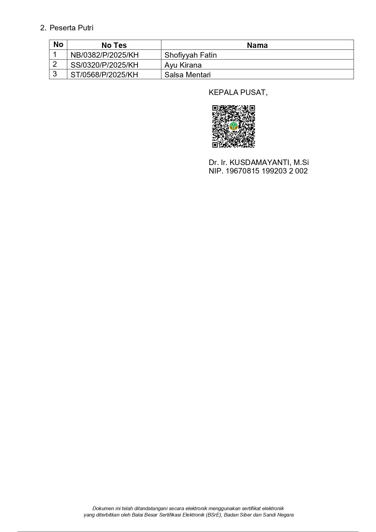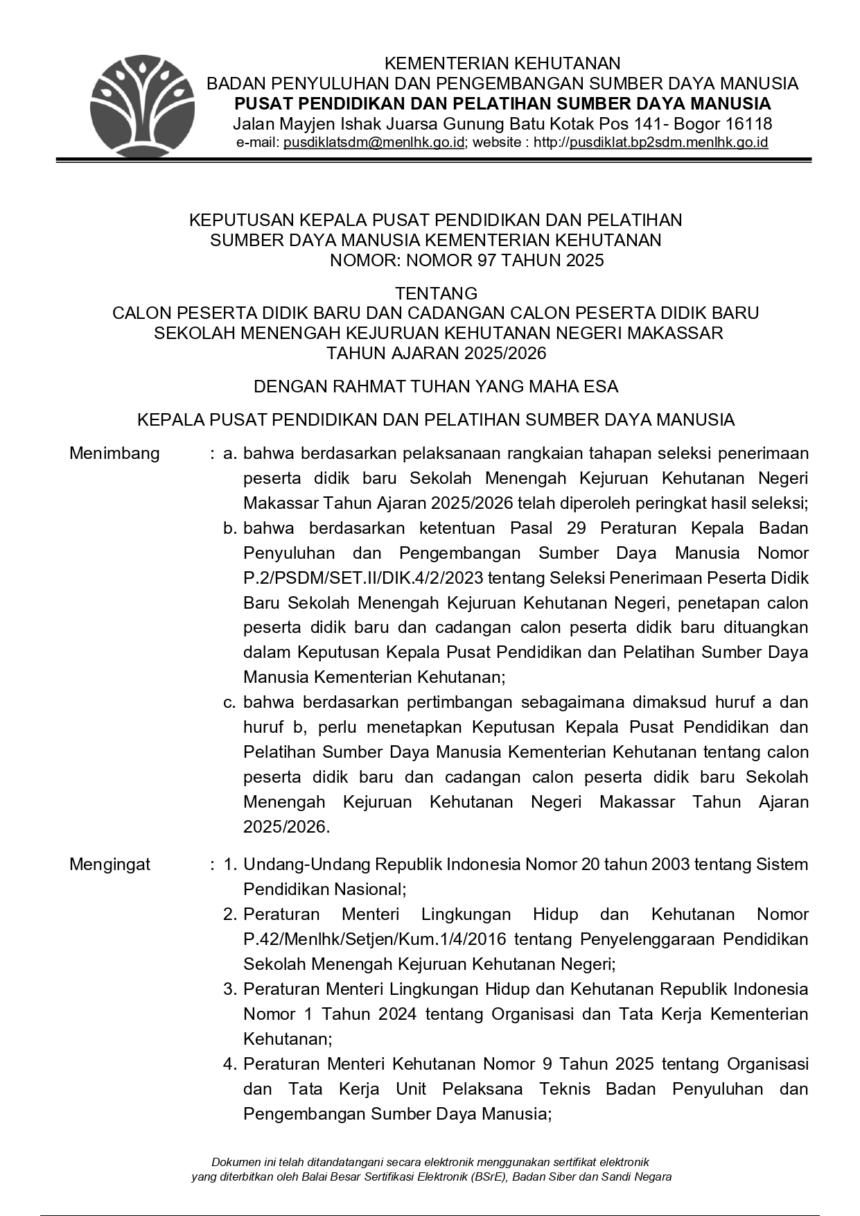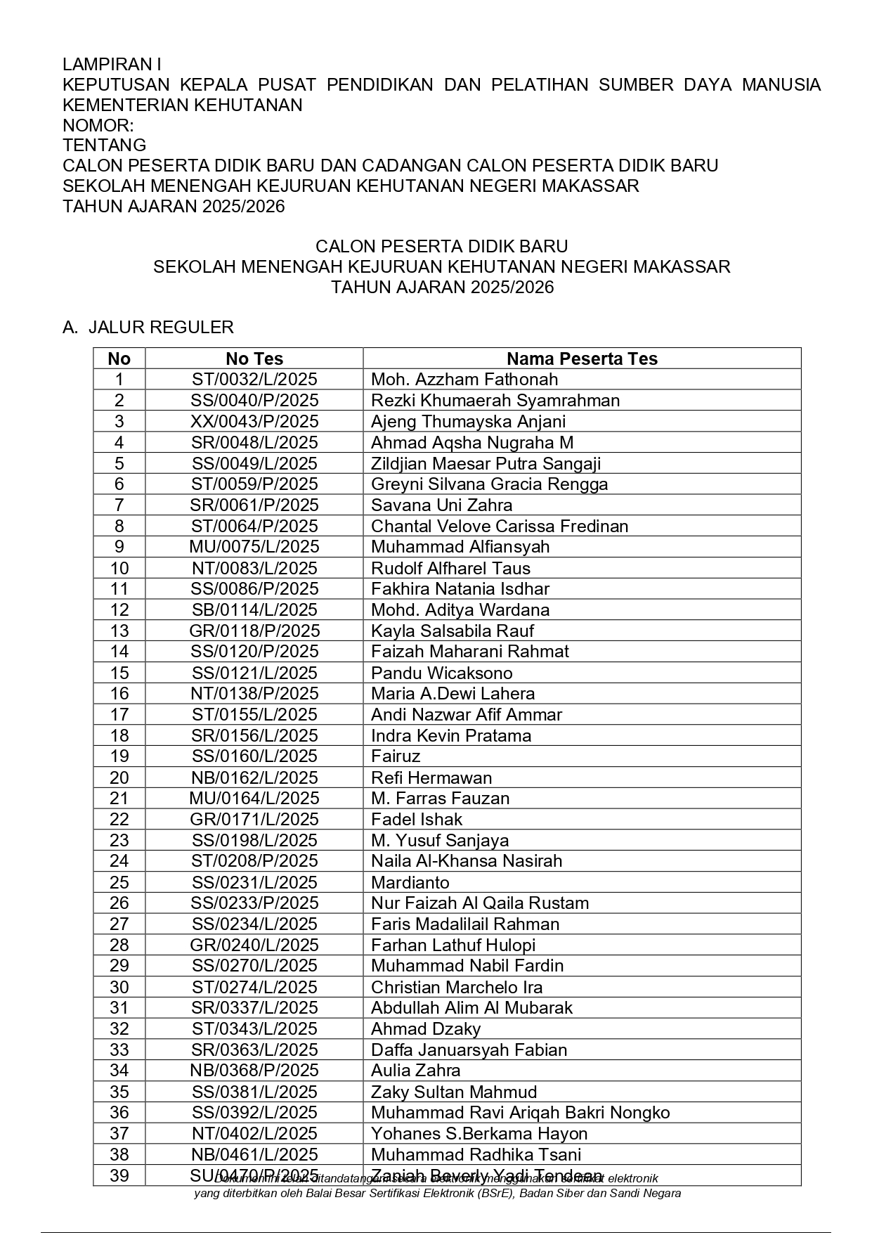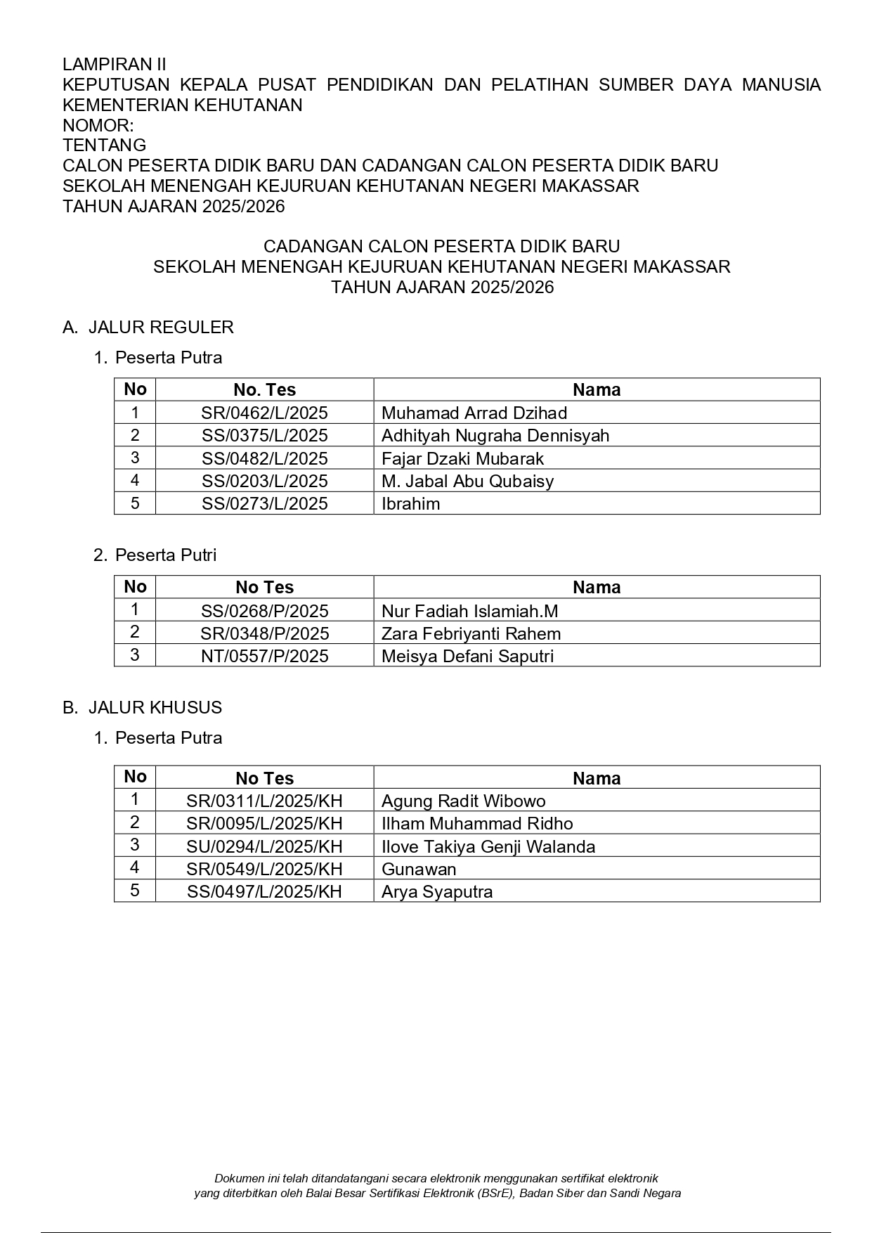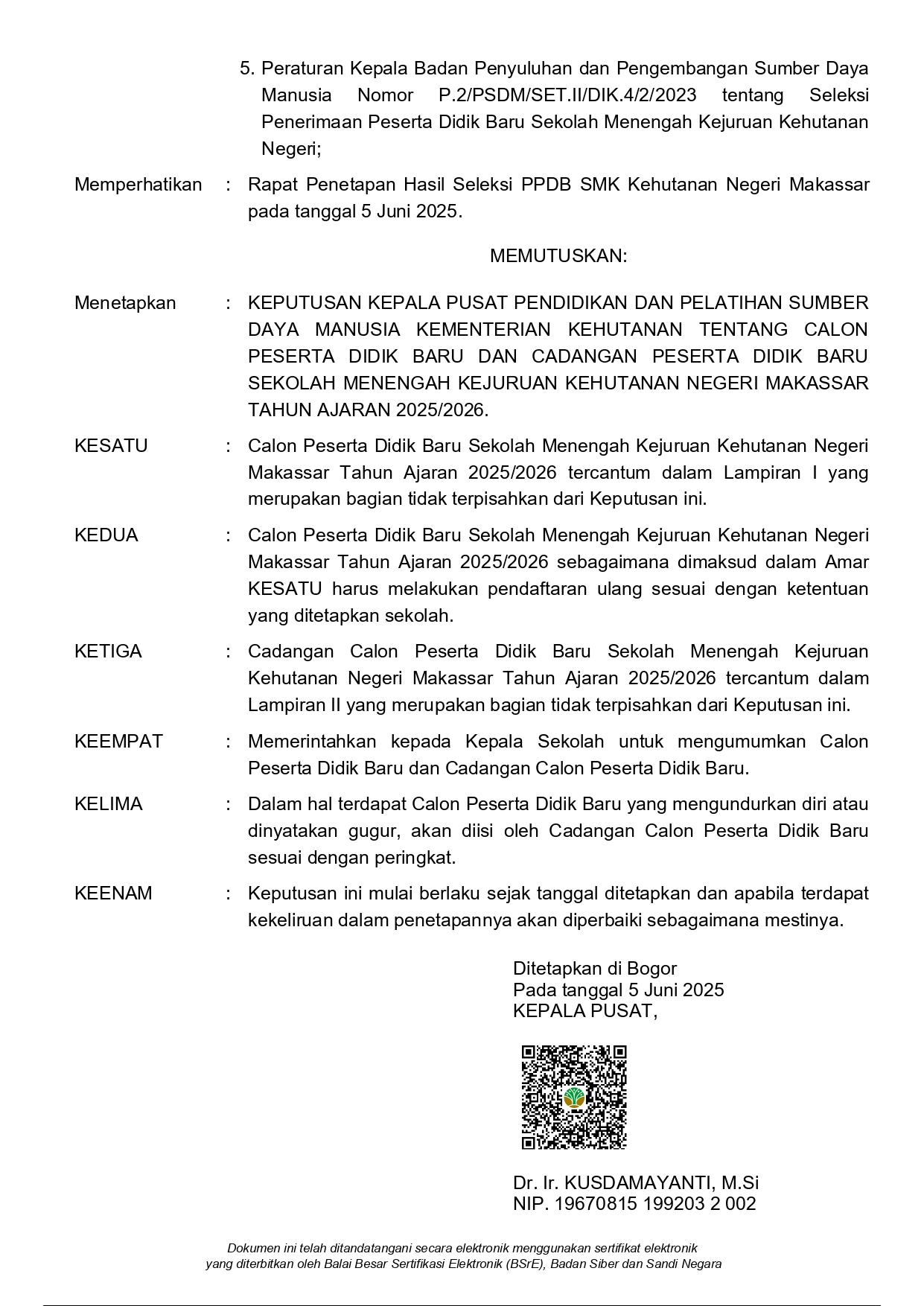 Hasil Seleksi Penerimaan Peserta Didik Baru (PPDB) SMK Kehutanan Makassar Tahun Pelajaran 2025/2026