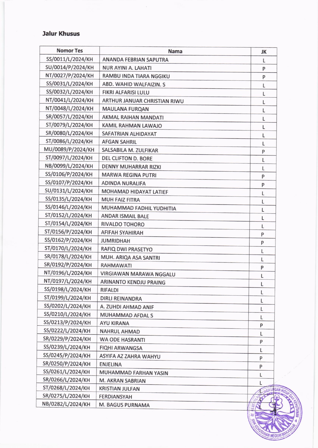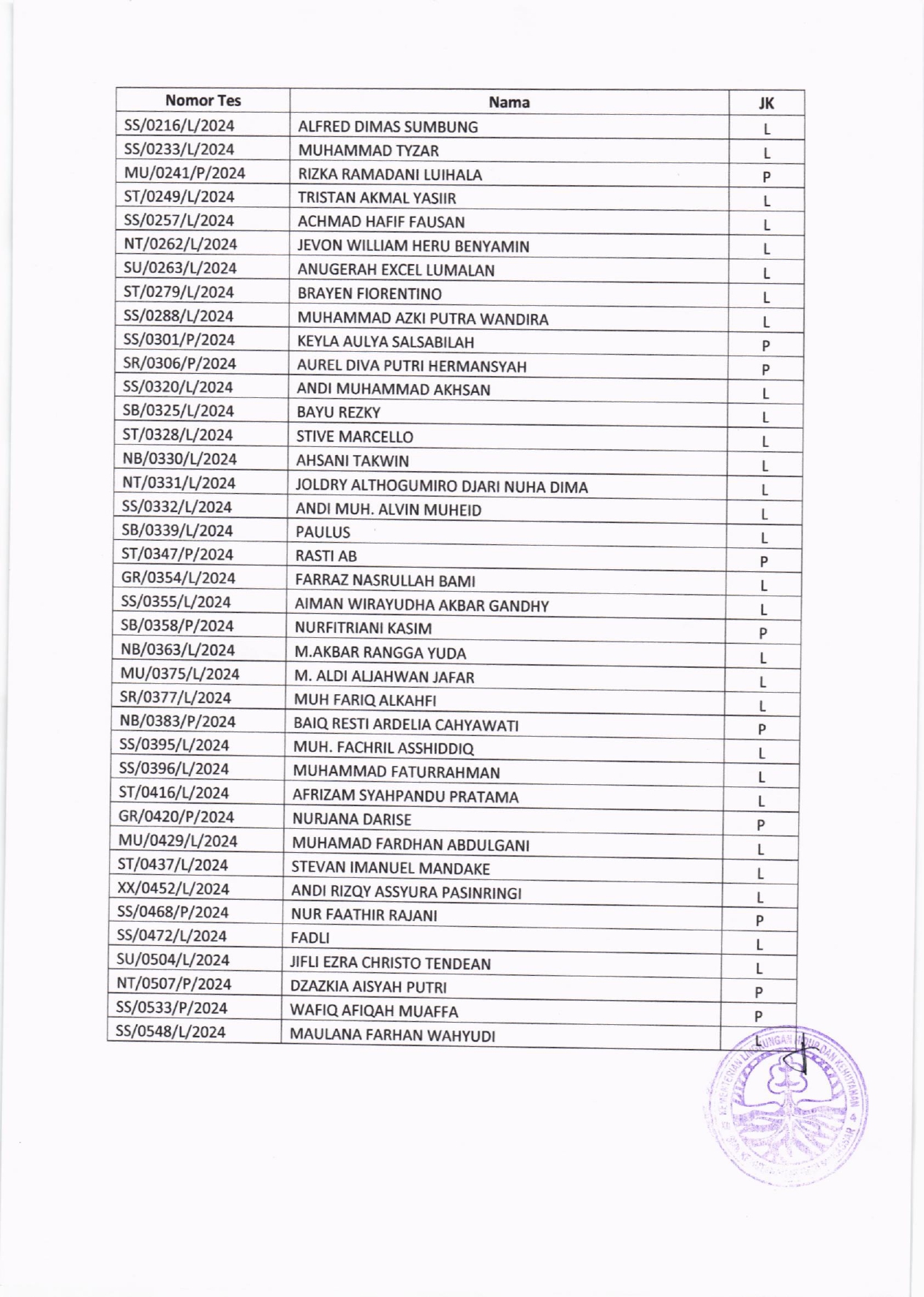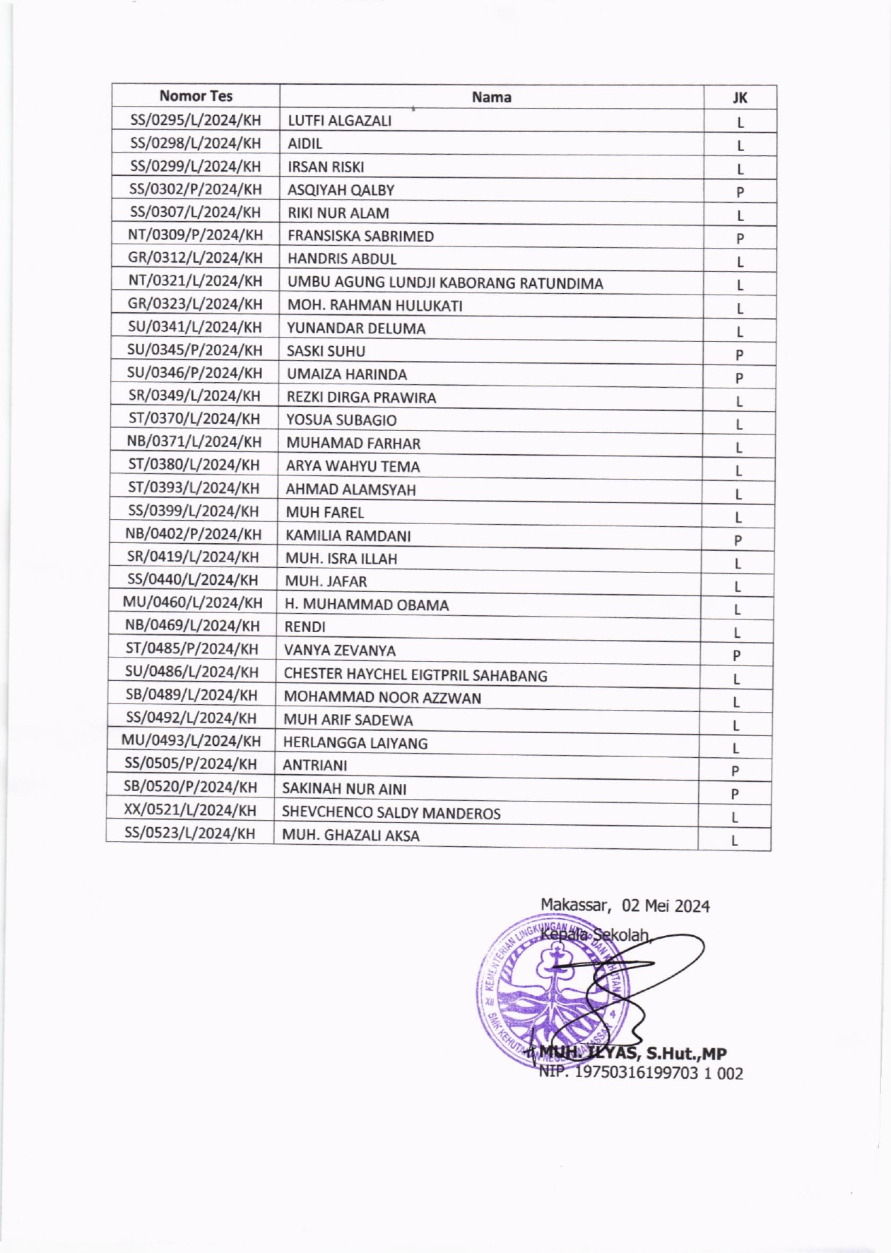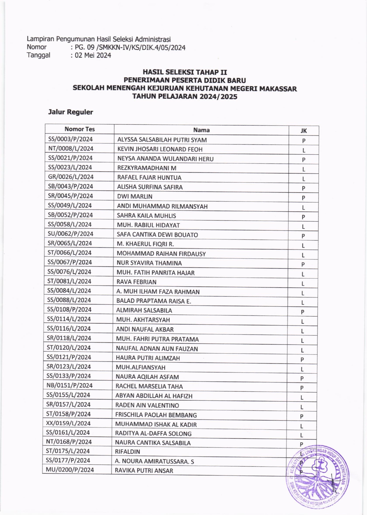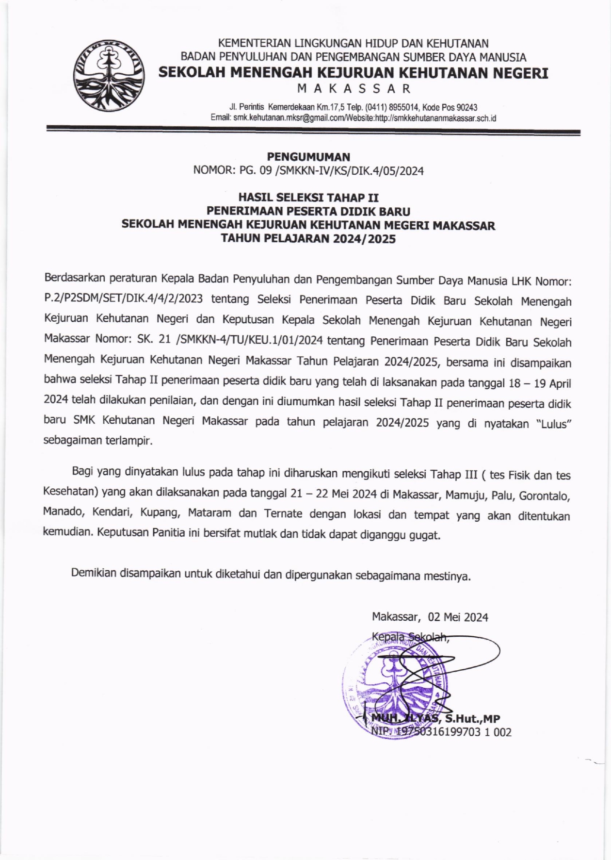 Hasil Seleksi Tes tertulis dan wawancara Penerimaan Peserta Didik Baru (PPDB)SMK Kehutanan Negeri Makassar Tahun Pelajaran 2024/2025