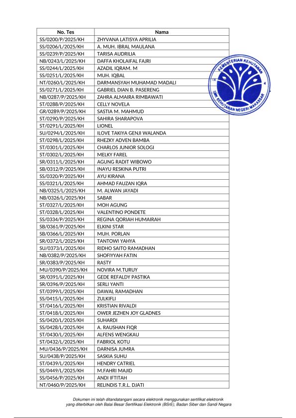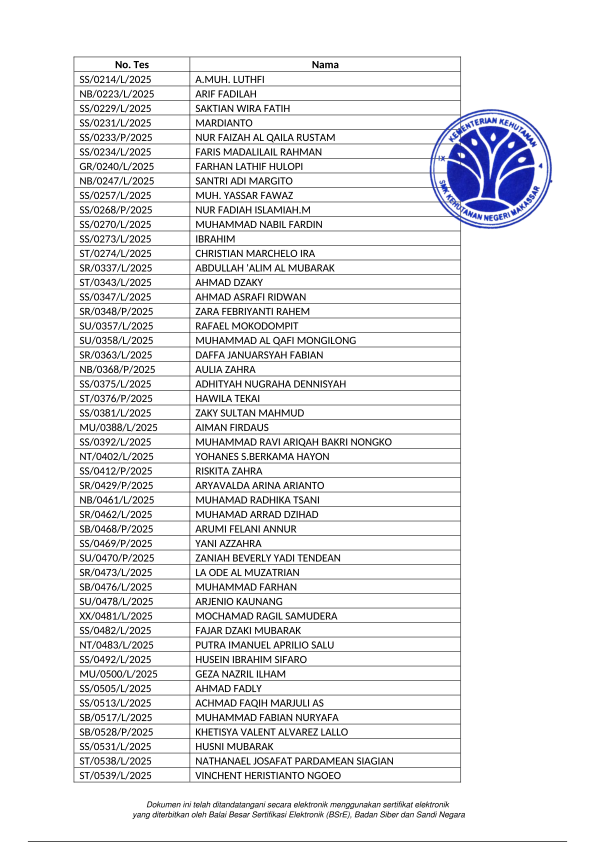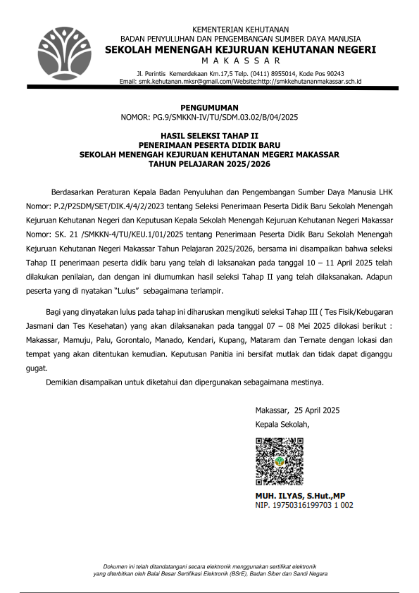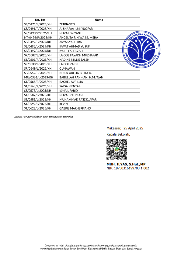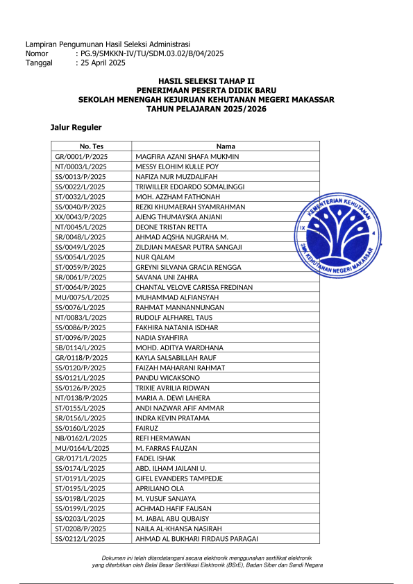 Hasil Seleksi Tahap II Penerimaan Peserta Didik Baru (PPDB) SMK Kehutanan Negeri Makassar Tahun Pelajaran 2025/2026