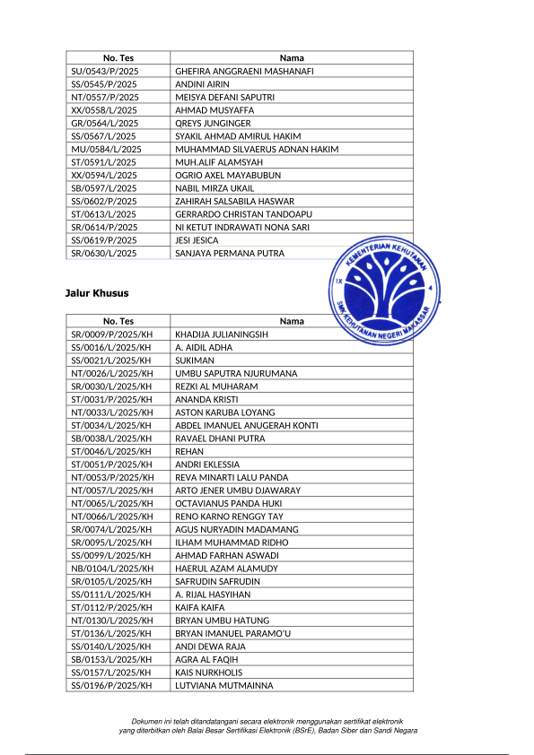 Bagi peserta yang dinyatakan lulus pada tahap ini diharuskan mengikuti seleksi Tahap III (Tes Fisik/Kebugaran Jasmani dan Tes Kesehatan) dan terus memantau perkembangan PPDB 2025 diwebsite SMK Kehutanan Negeri Makassar dan di sosial media SMK Kehutanan Negeri Makassar