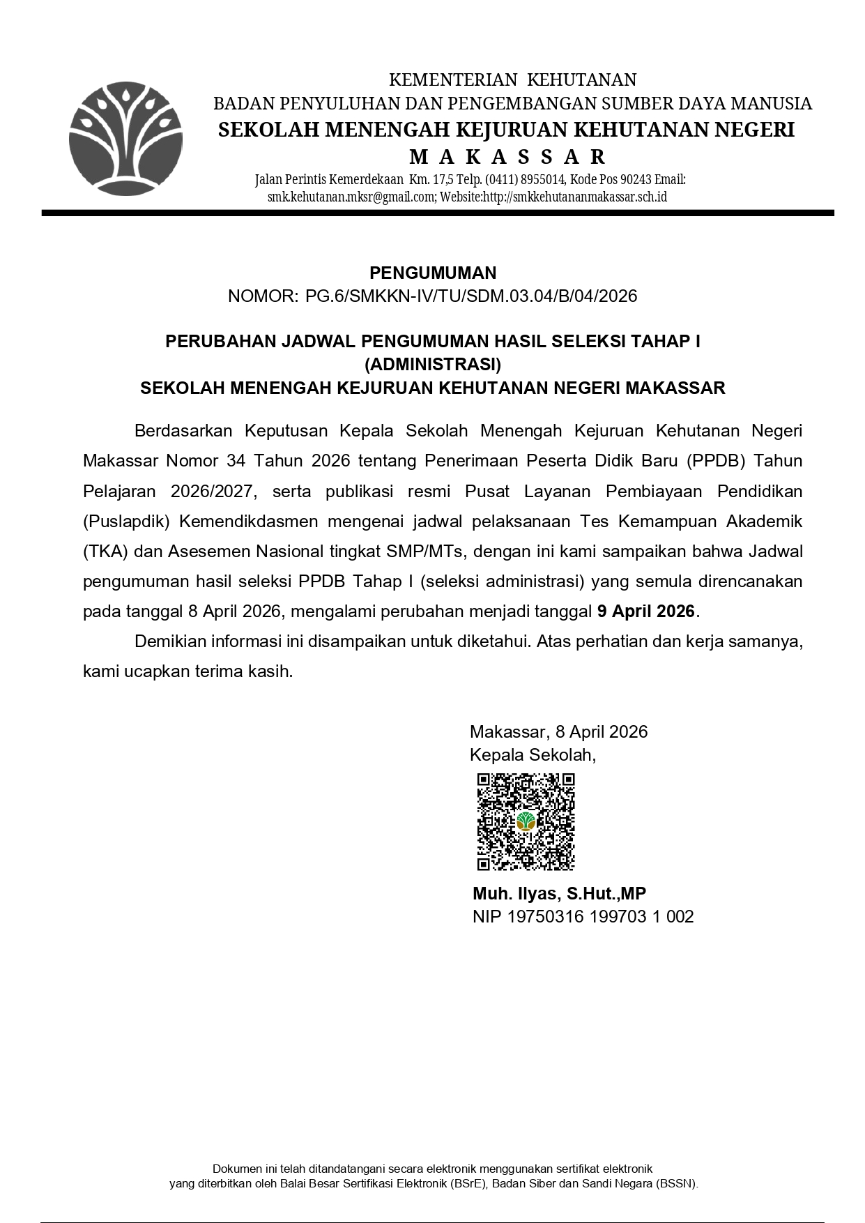 Berdasarkan Keputusan Kepala Sekolah Menengah Kejuruan Kehutanan Negeri Makassar Nomor 34 Tahun 2026 tentang Penerimaan Peserta Didik Baru (PPDB) Tahun Pelajaran 2026/2027, serta publikasi resmi Pusat Layanan Pembiayaan Pendidikan (Puslapdik) Kemendikdasmen mengenai jadwal pelaksanaan Tes Kemampuan Akademik (TKA) dan Asesemen Nasional tingkat SMP/MTs, dengan ini kami sampaikan bahwa Jadwal pengumuman hasil seleksi PPDB Tahap I (seleksi administrasi) yang semula direncanakan pada tanggal 8 April 2026, mengalami perubahan menjadi tanggal 9 April 2026.